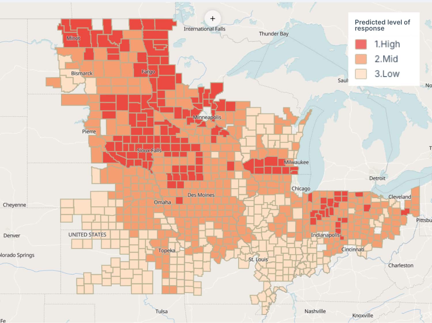 This process allows the marketing team at a company to have an approximation of where their product stands in comparison to others on the market. For example, the map below identifies areas within the U.S. Corn Belt with expected low, mid and high response to a biological input based on a soil-weather model generated from a large network of trials run across multiple years. Visual positioning products generated based on this modeling approach provides a strong tool for aligning communication both within a company, and with clients and allows the estimation of the potential size of the market.